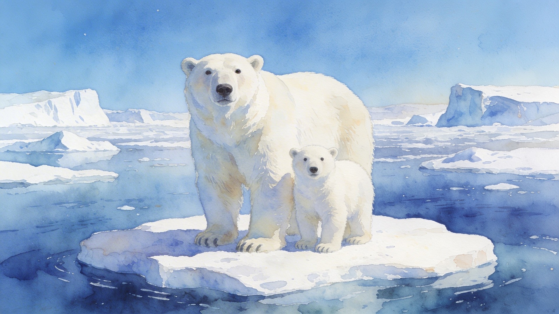 In the style of a watercolor painting. A large polar bear and her small cub standing side by side on a floating ice floe in the Arctic ocean, both fully visible and facing the camera. Icebergs and icy water stretch into the distance behind them under a bright clear Arctic blue sky