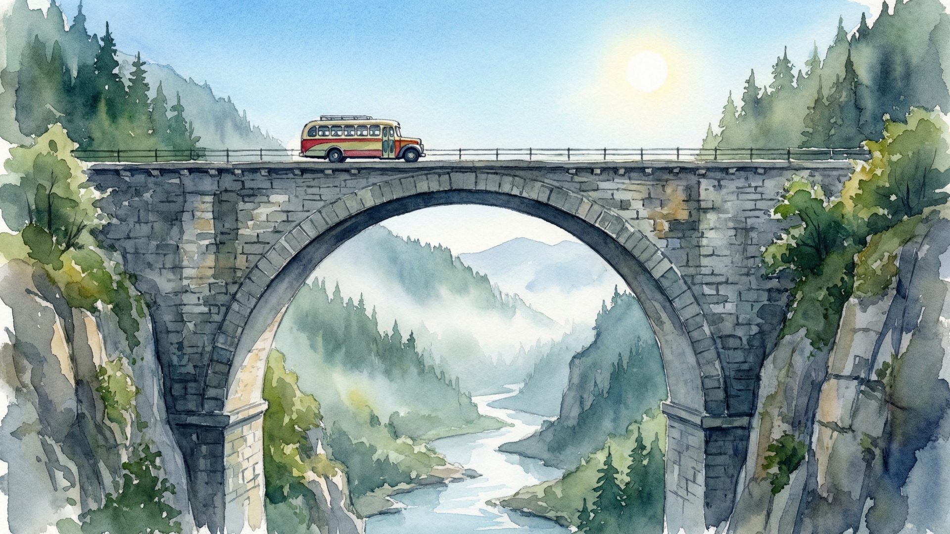 In the style of a watercolor painting. A bus seen from the side crossing a tall arched stone bridge spanning a dramatic gorge. The bus is driving across the bridge from left to right. The bridge is made of ancient grey stone with a large arch. Far below the bridge is a deep misty river valley. Forested mountains and cliffs rise in the distance. The scene shows the full bus and bridge clearly. Clear blue sky with the sun fully visible in the distance