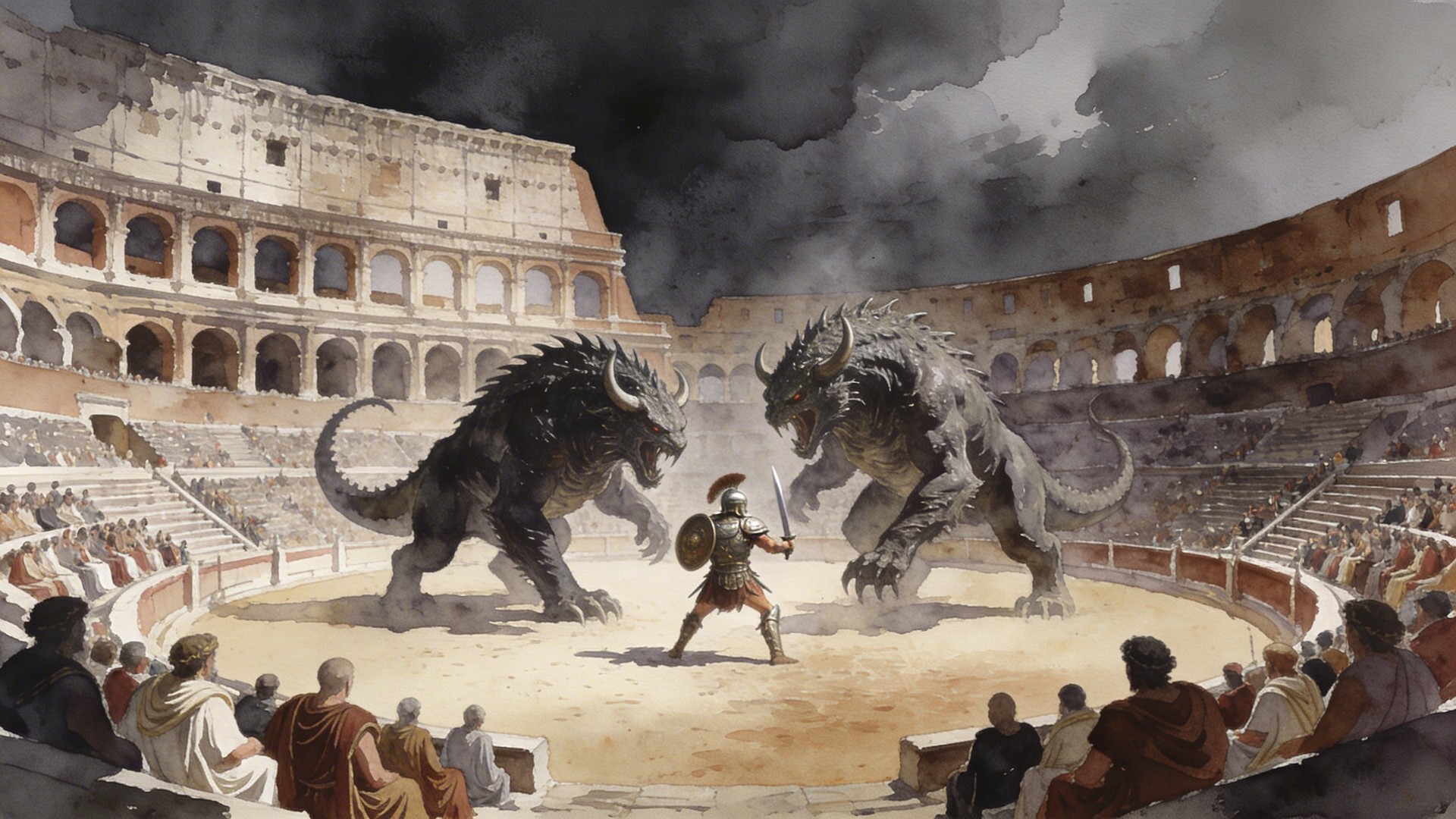In the style of a watercolor painting. A vast ancient outdoors Roman colosseum arena with a gladiator warrior fighting a massive two-headed monster in the center. Crowds of spectators in traditional Roman tunics and togas seated in the grandstands surrounding the arena. There are no people on the arena floor. Dark dramatic, overcast sky above