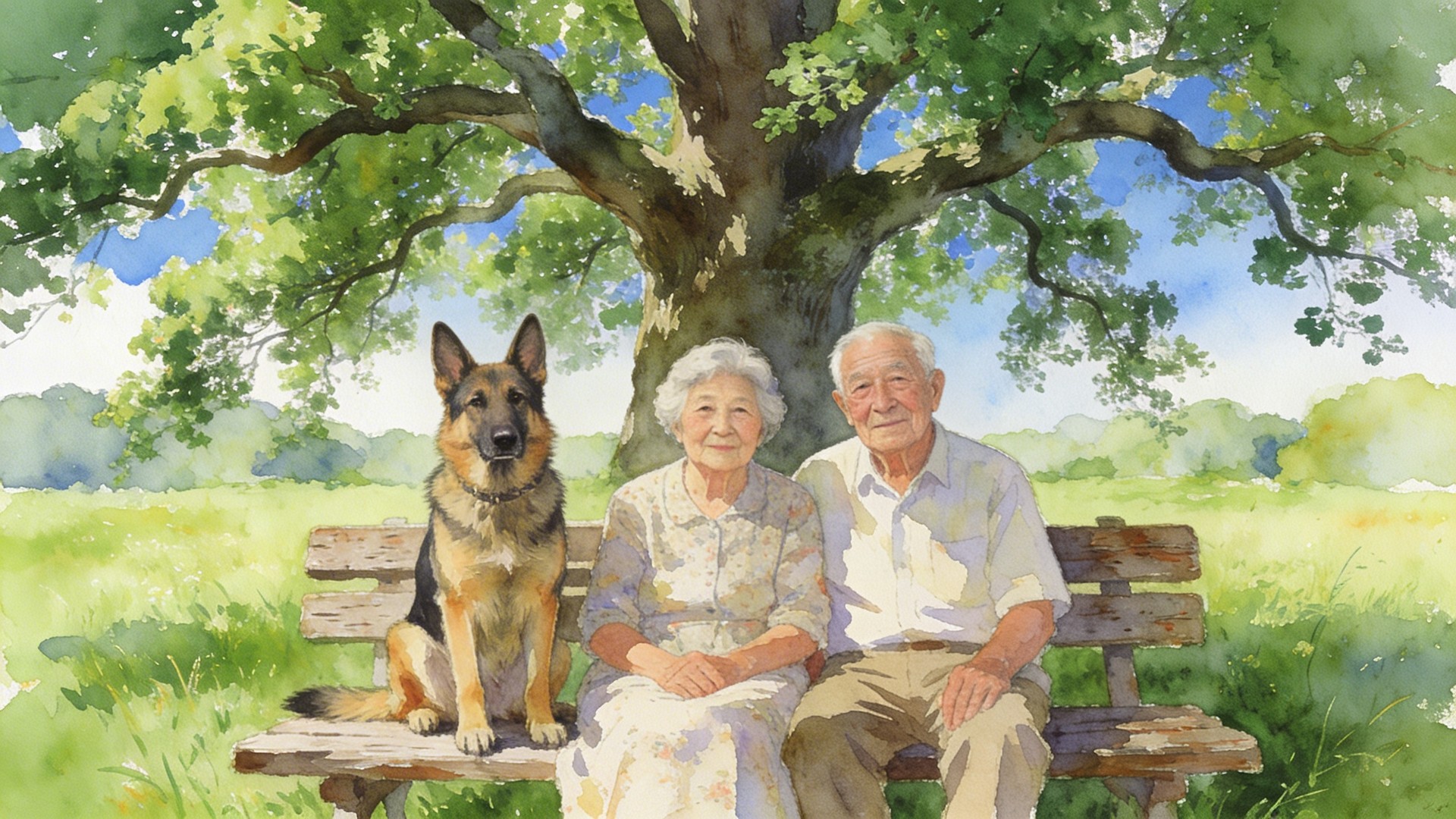 In the style of a watercolor painting. An elderly couple in their 80s sitting closely together on an old wooden bench in a lush green summer field on a bright sunny day. A German Shepherd dog sits upright on the bench beside them. They are sitting under the wide spreading canopy of a large oak tree in full summer leaf, with thick green foliage overhead and blue sky visible through the branches. Both facing the camera