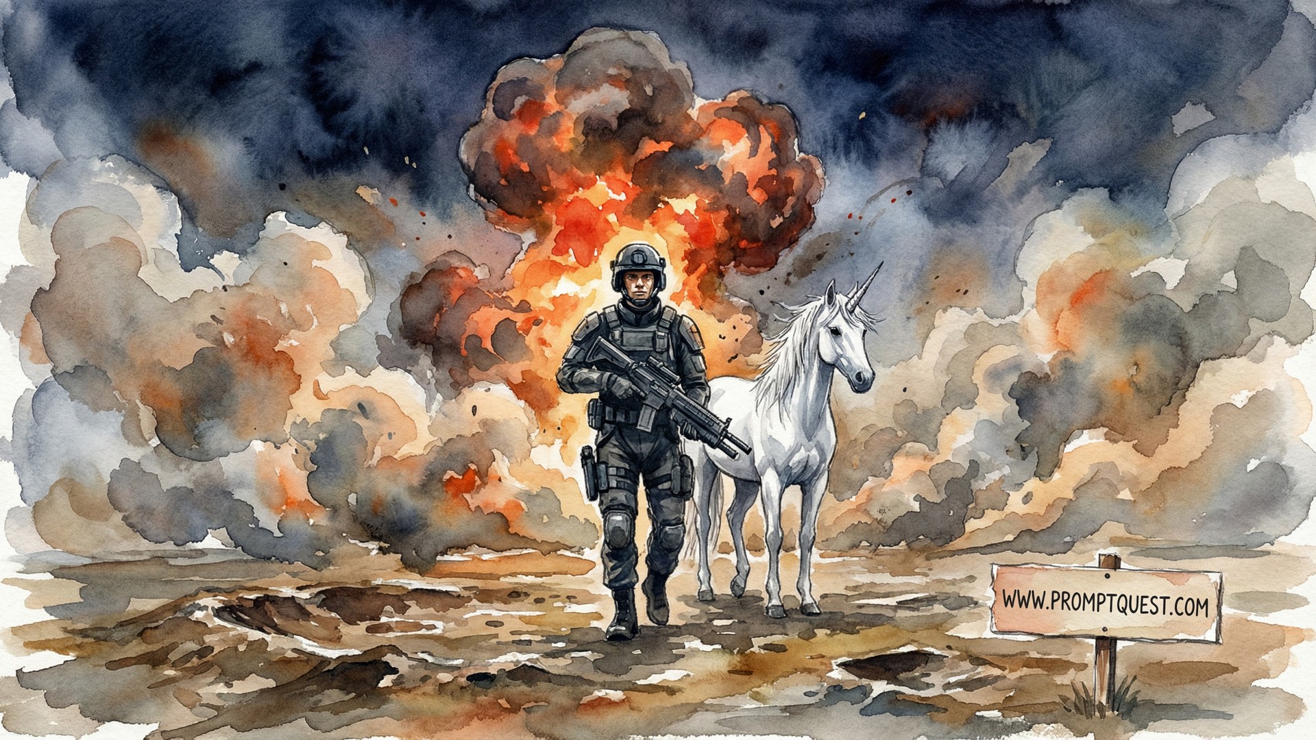 In the style of a watercolor painting. A lone soldier in black futuristic combat gear holding a machine gun, standing centered in the frame in an open muddy warzone. A clean white unicorn stands calmly beside him. Thick smoke and dust fill the air around them. A large explosion erupts directly behind him with fire rising into a dark dramatic smoky sky. The soldier faces the camera